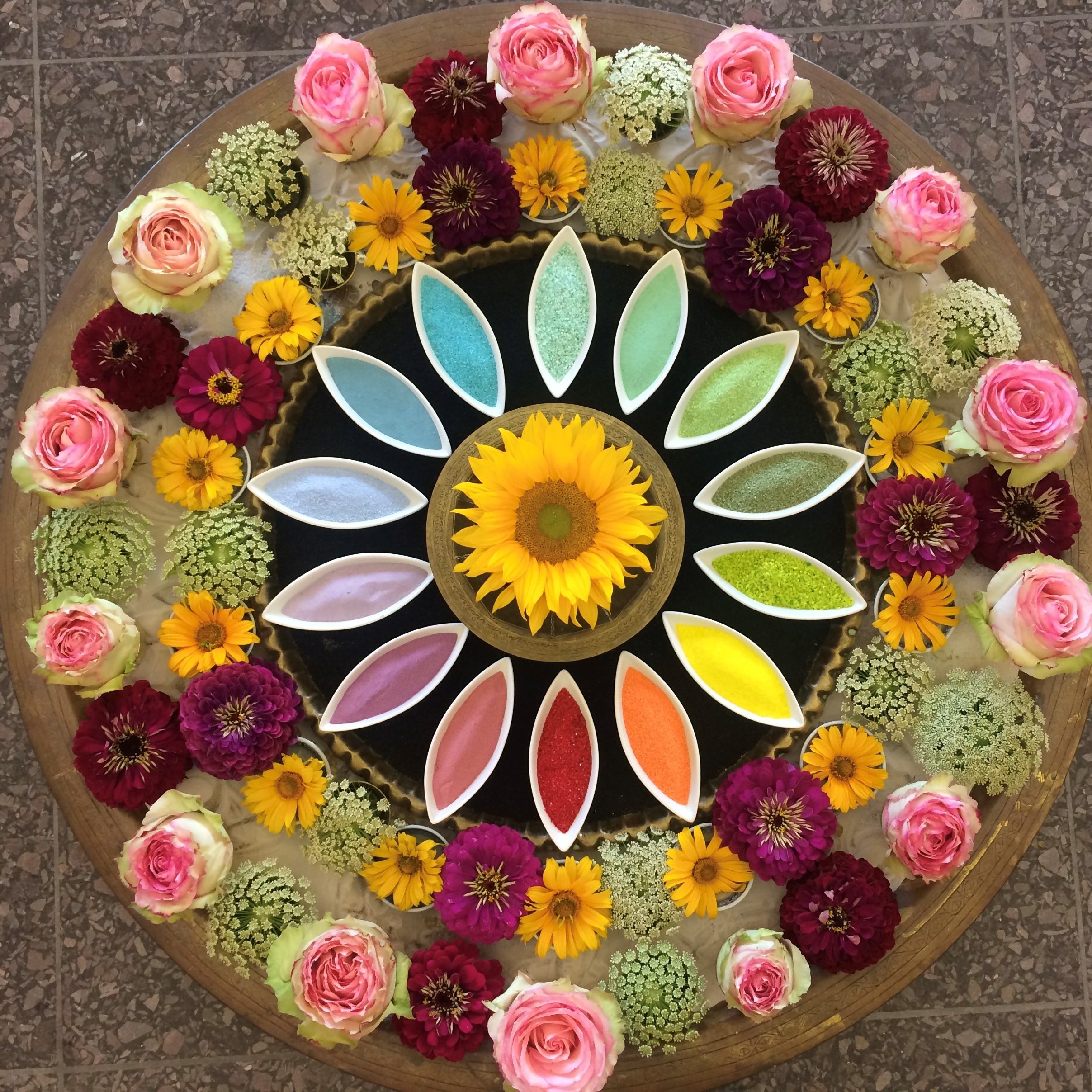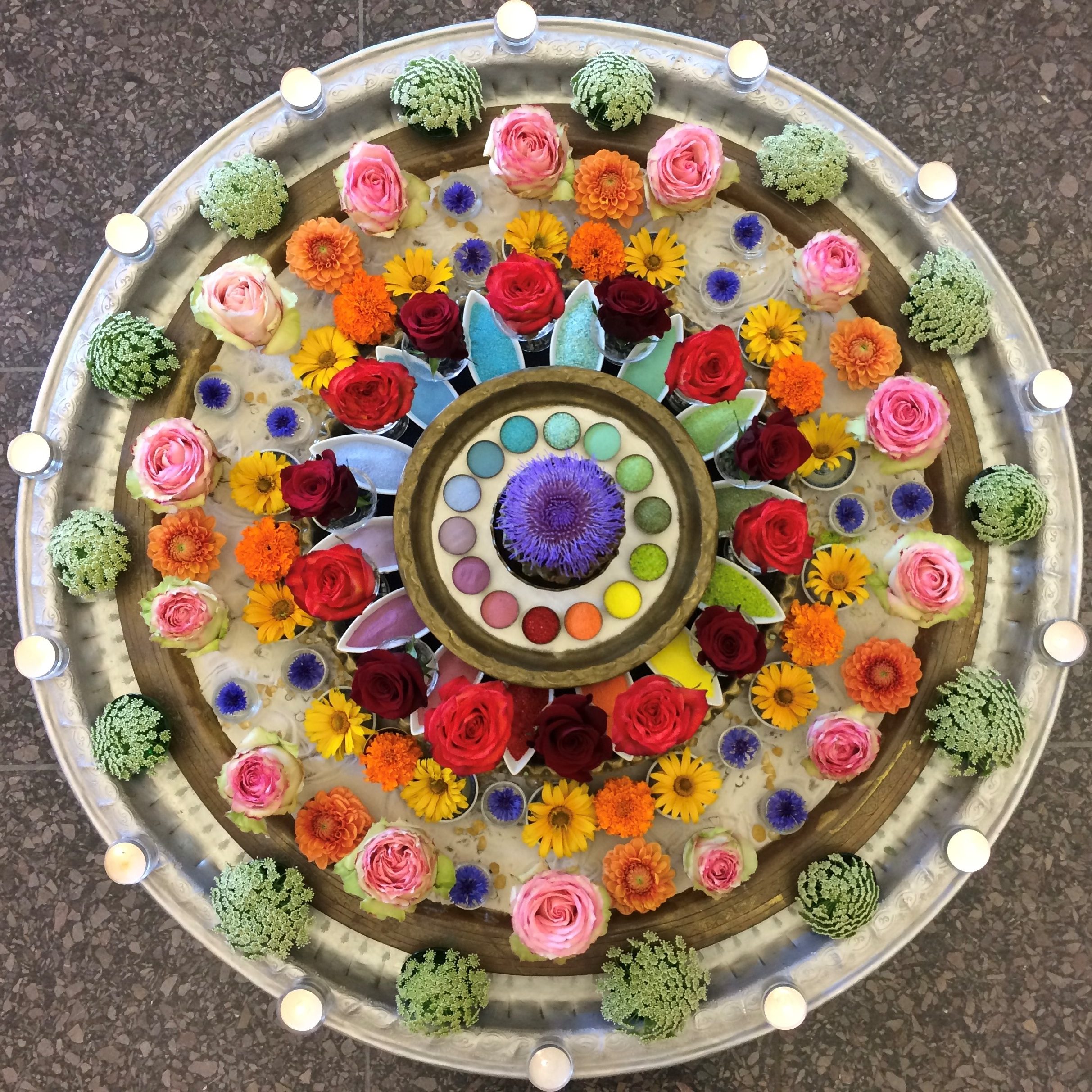 Gerne kreiere ich unter Einbezug persönlicher Themen Mandalas, die in einem Ritual von einer Gruppe ausgelegt und danach wieder aufgelöst werden.